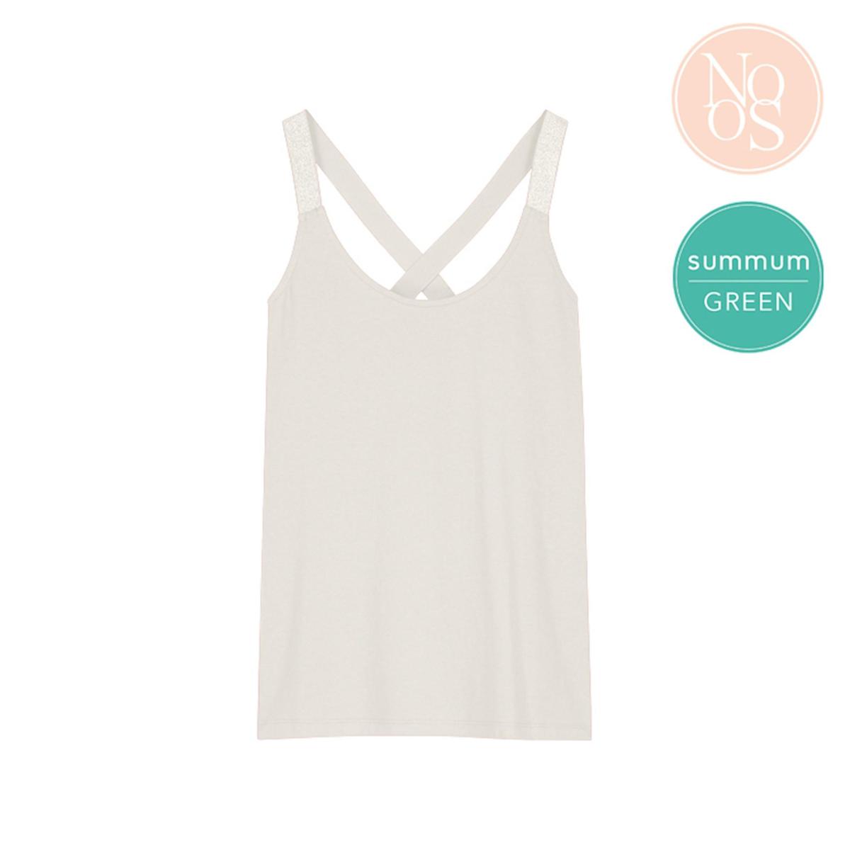 Een Luxury Basic singlettop met een ronde hals van biologisch katoen met op de rug kruisende schouderbanden van een fijne stretchkwaliteit met glittergaren.