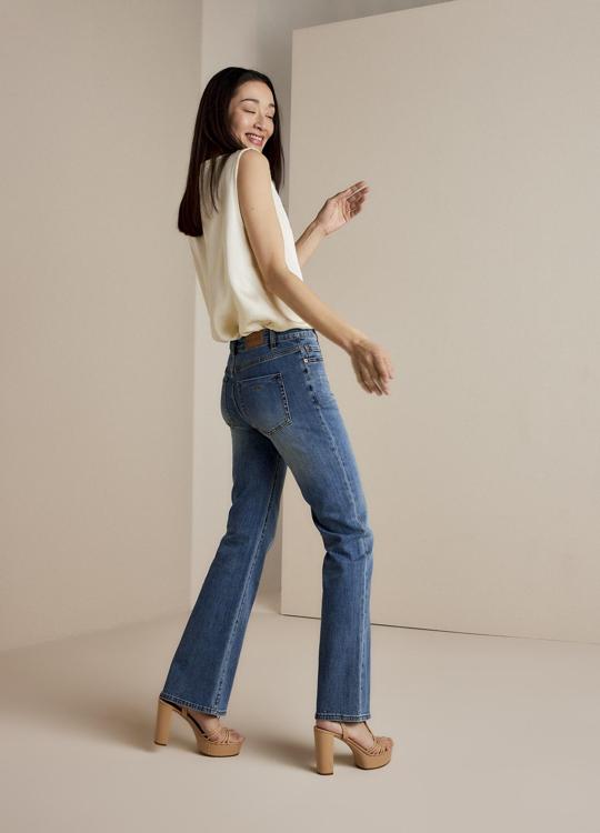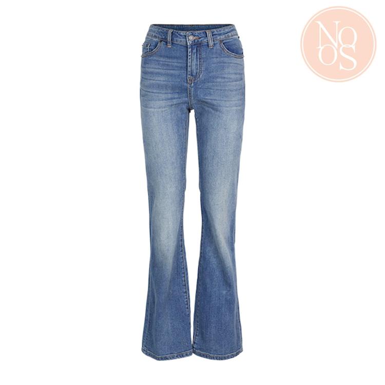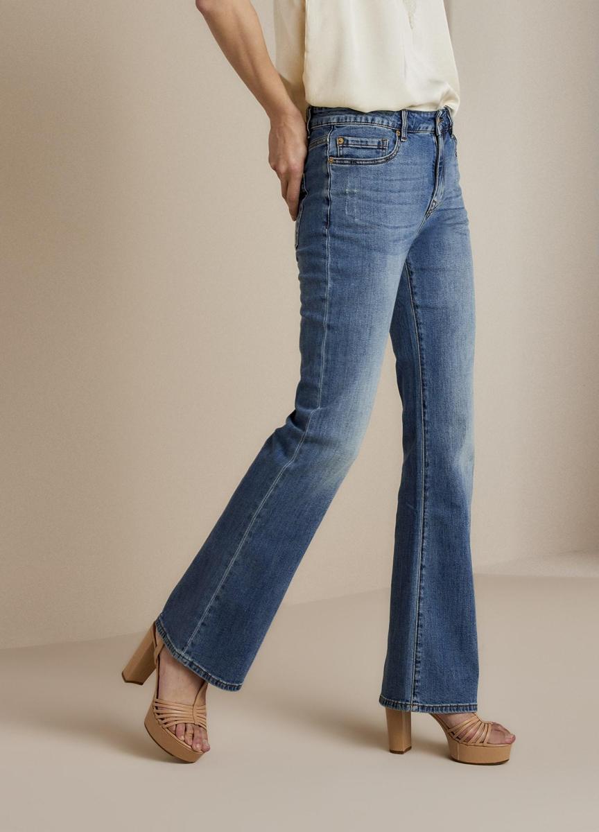 Een flared spijkerbroek voorzien van een verwassen look, een middelhoge taille, uitlopende broekspijpen, voor- en achterzakken, een knoopsluiting en een gulp met ritssluiting.