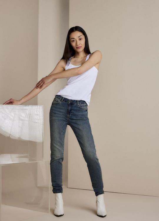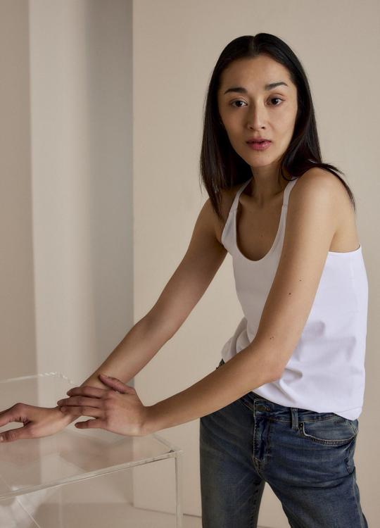 Een Luxury Basic singlettop met een ronde hals van biologisch katoen met op de rug kruisende schouderbanden van een fijne stretchkwaliteit met glittergaren.
