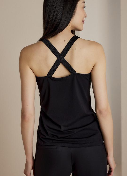 Een Luxury Basic singlettop met een ronde hals van biologisch katoen met op de rug kruisende schouderbanden van een fijne stretchkwaliteit met glittergaren.