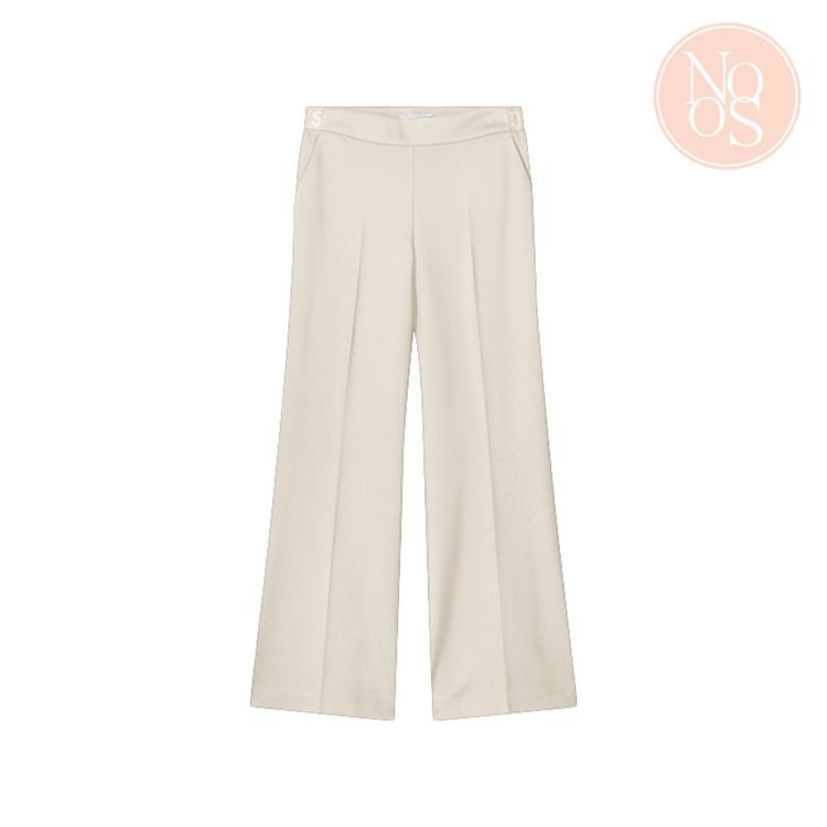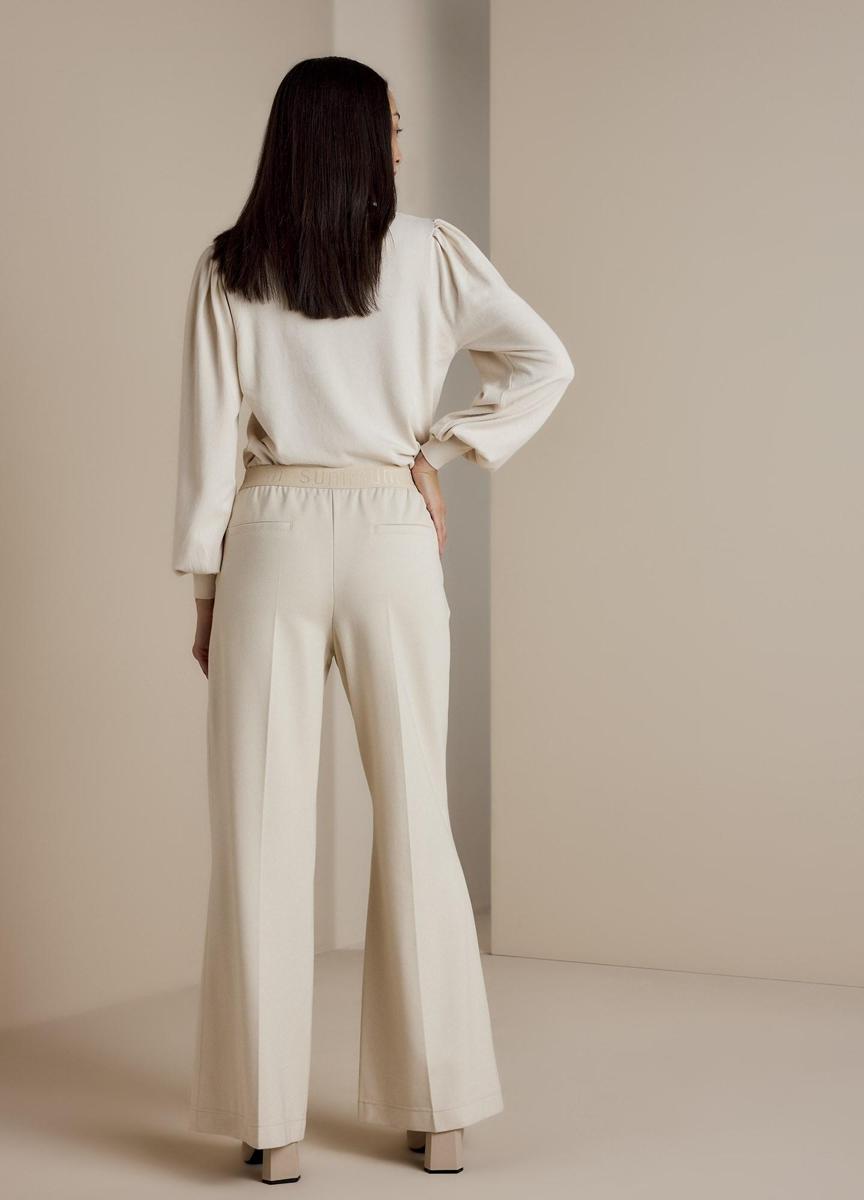 Een bootcut broek met rechte pijp en een persvouw voor. De stoffen tailleband voor bevat elastiek. De achterkant van de tailleband heeft elastiek met het Summum-logo. Dichtgestikte paspels achter.
