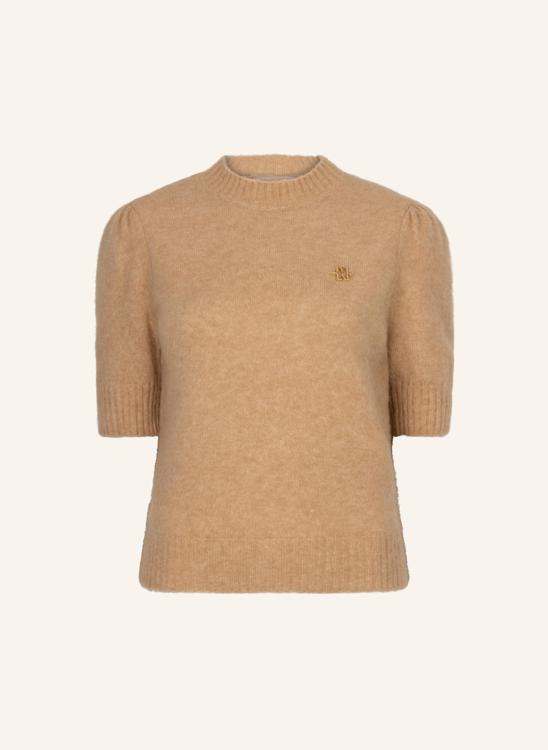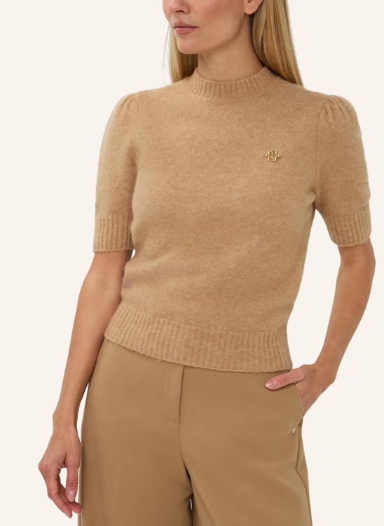 De JOSH V Franka dames top in de kleur Light Brown Melange combineert elegantie met comfort. De fijngebreide trui met korte mouwen is gemaakt van een zachte wolmix en stretch, en kriebelt niet. Aan de voorkant is de top verrijkt met een goudkleurig JOSH V monogram logo, een subtiele finishing touch. Draag de knitwear top met een jeans voor een casual look of combineer met een rok voor een meer geklede outfit.