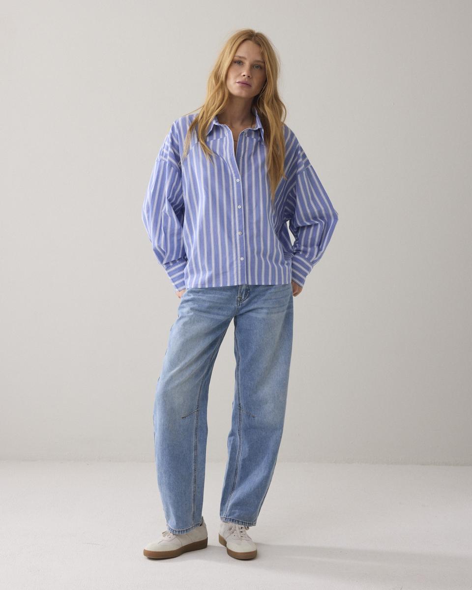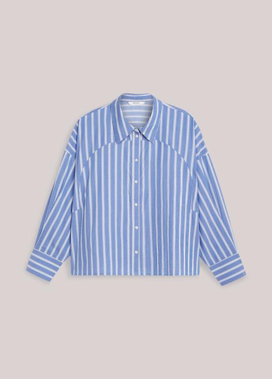 Ruimvallende blouse in een zachte katoenen kwaliteit met streepprint. Het model heeft een ronde voorpas met verticale strepen en horizontale strepen op de achterpas en manchetten.