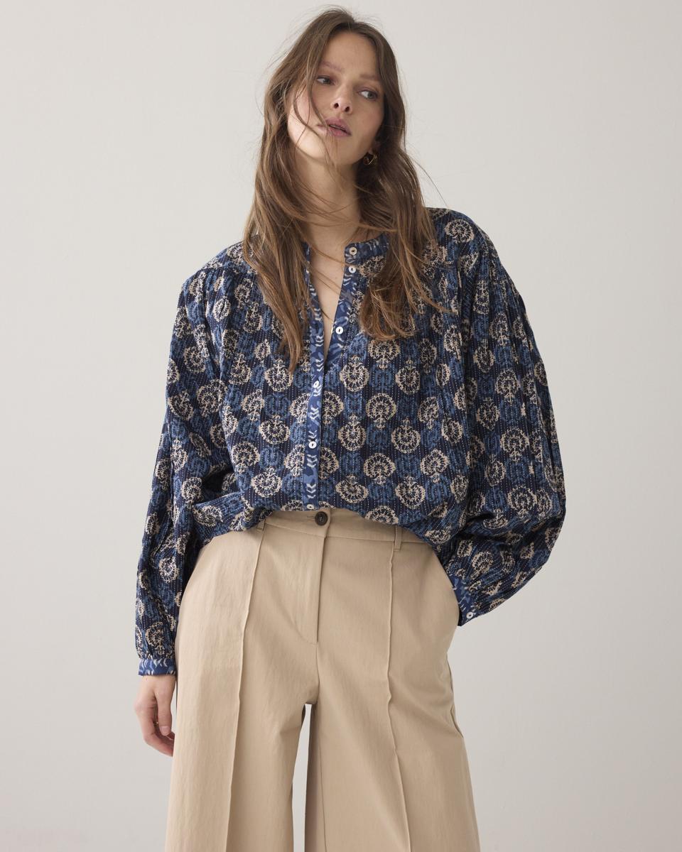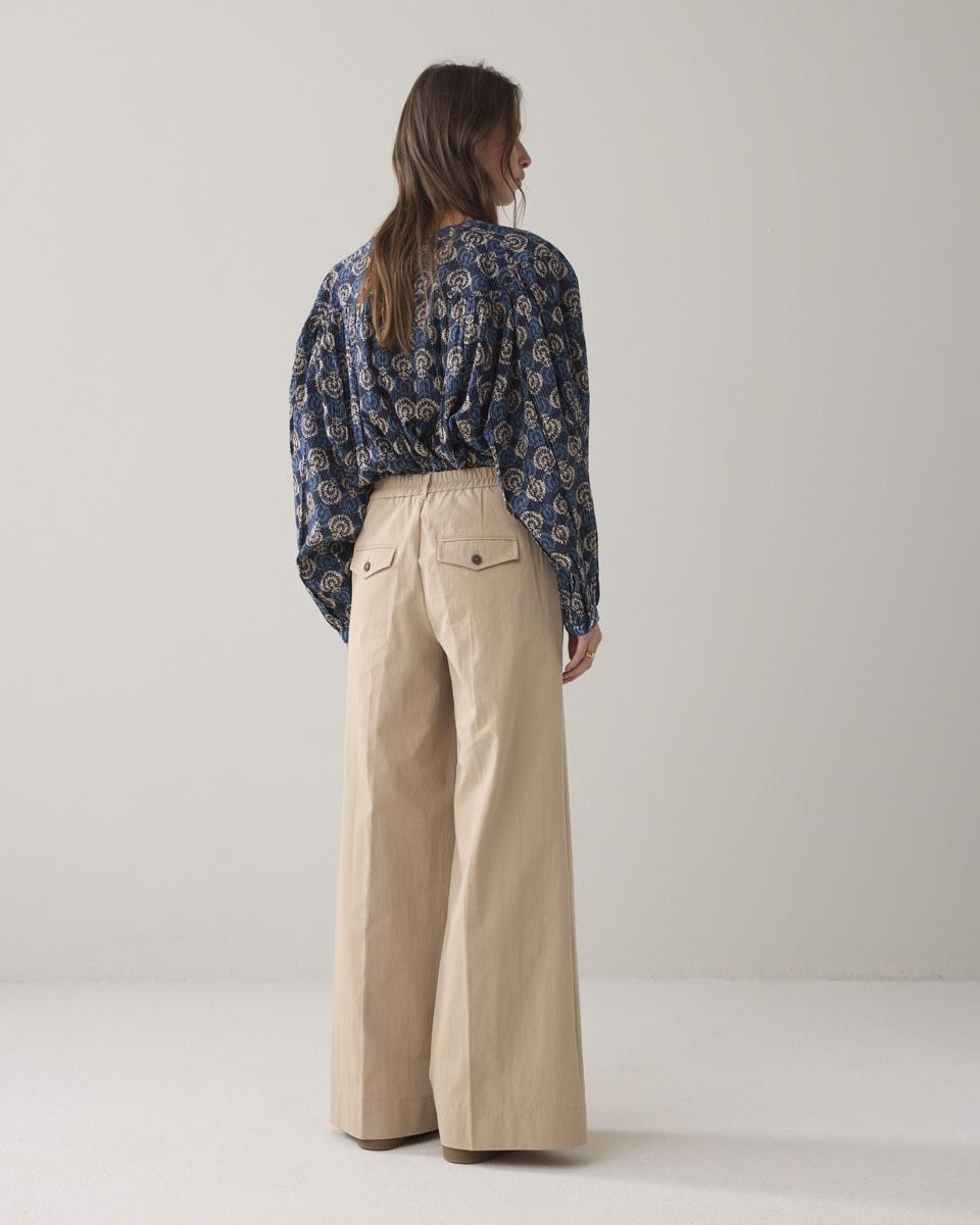 Broek van gladde katoenblend met een lichte glans en comfortabele fit. De broek heeft wijde pijpen met pintuck, steekzakken voor en fake klepzakken met contrasterende knopen. De elastische tailleband achter zorgt voor extra draagcomfort.