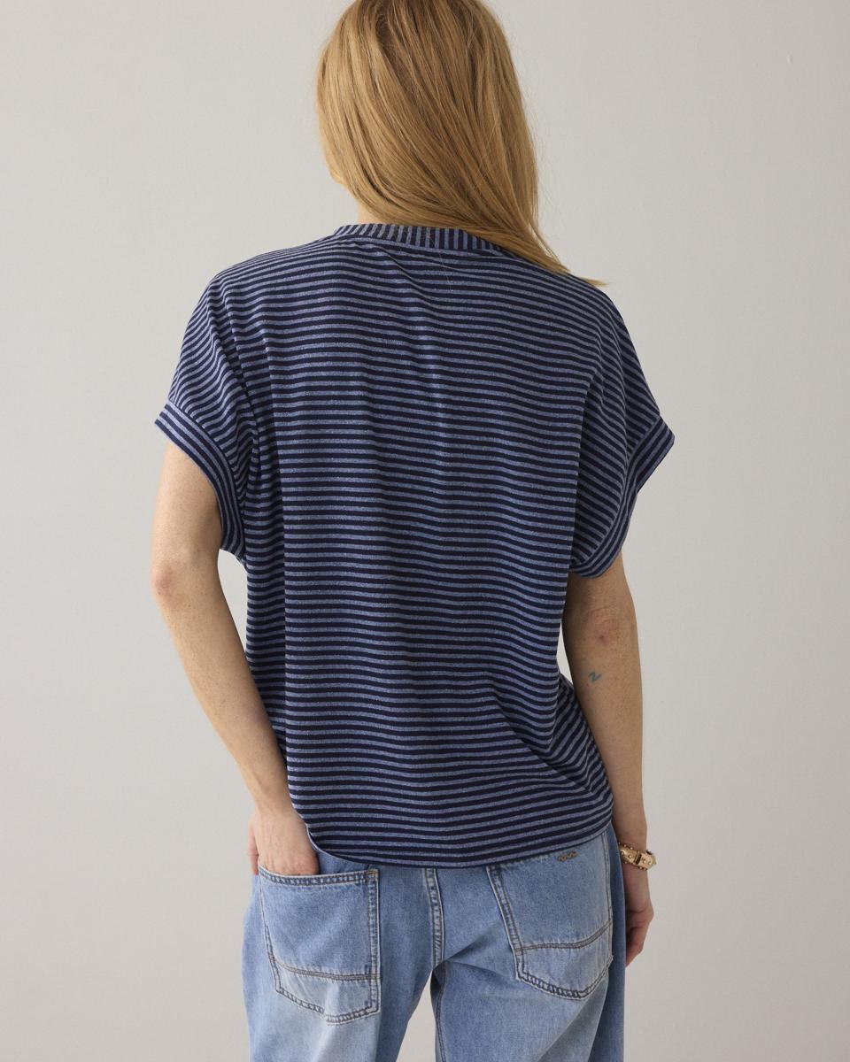Top van een Italiaanse stof met subtiele two-tone streep en ingeweven lurex. De top heeft een boxy fit met hoge, iets wijdere ronde hals, aangeknipte kapmouwtjes en brede boorden van dezelfde stof.