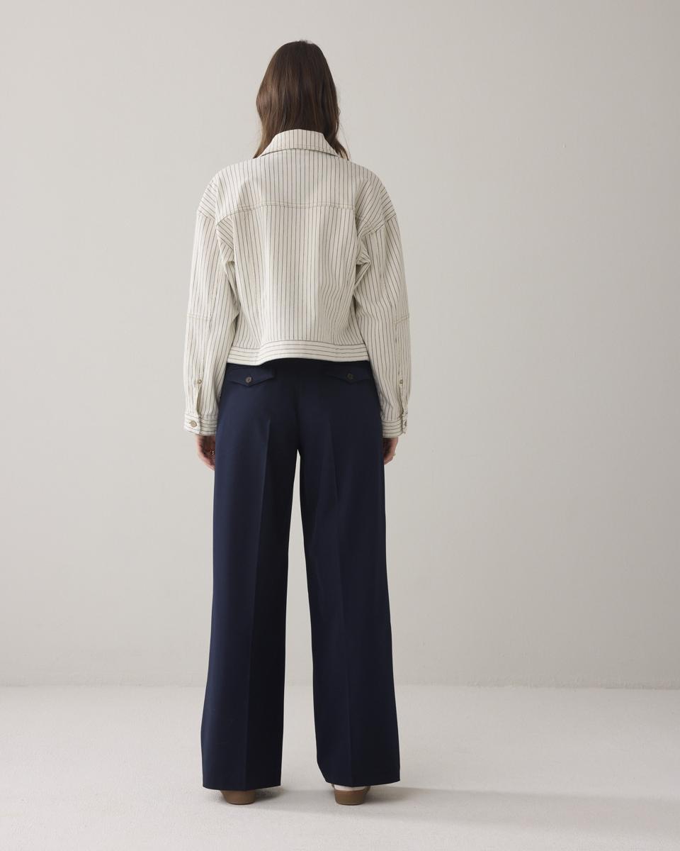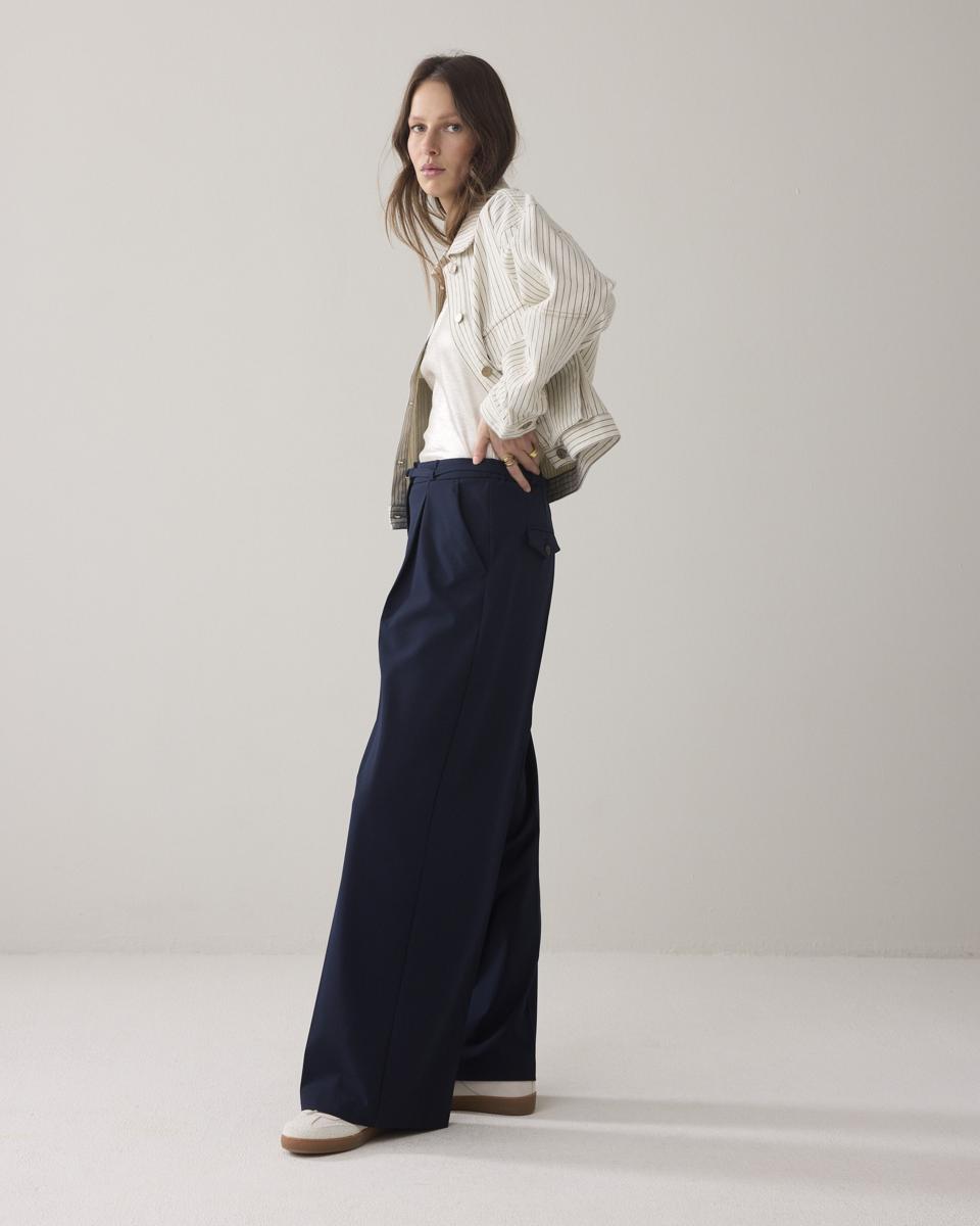 Broek van soepele viscoseblend met rechte pijpen. De broek heeft dubbele riemlussen voor een hoog of laag riempje en steek- en strookzakken. Voorzien van een gladde voorkant en dubbele plooi bij de broeksband.