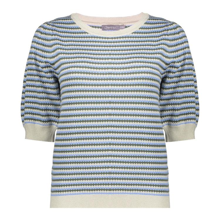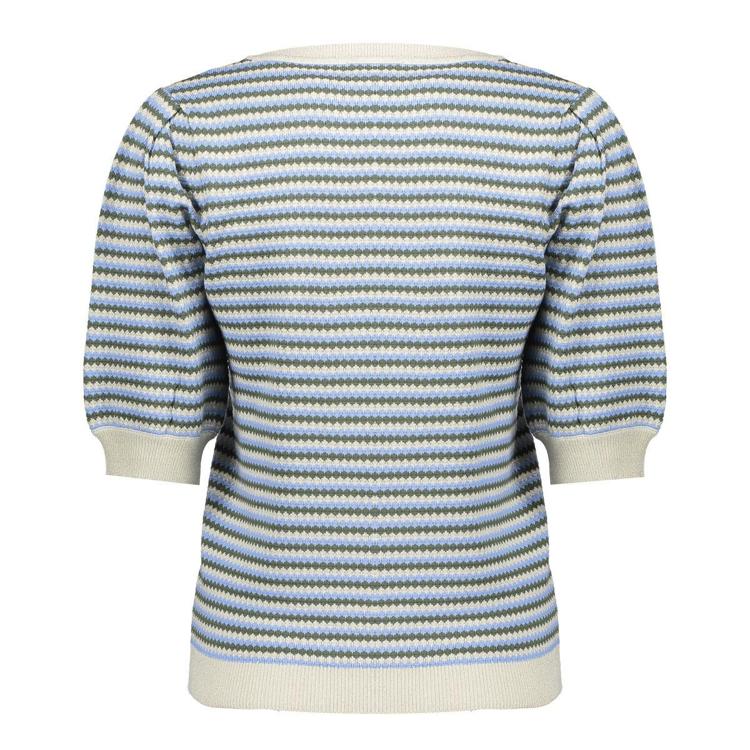 Deze pullover uit onze S26-1 collectie is een verfijnde knit met een speels streeppatroon in zachte blauwtinten en groen. De aangesloten pasvorm valt mooi langs het lichaam, terwijl de korte mouwen met lichte pof zorgen voor een vrouwelijke uitstraling en er is een vleugje lurex aan toegevoegd. Perfect te combineren met een linnen broek of rok.