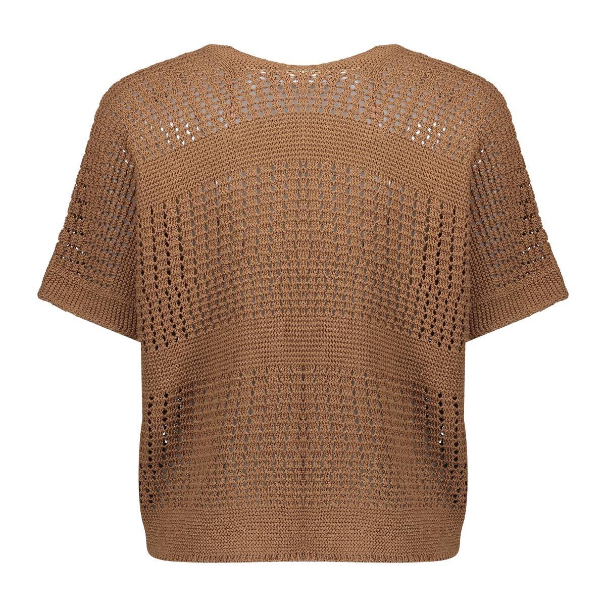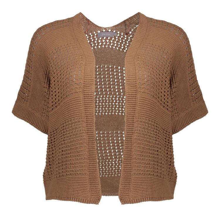 Dit vest uit onze S26-1 collectie is uitgevoerd in een warme bruintint en heeft een verfijnd opengewerkt breipatroon. De lage schouderinzet en korte mouwen zorgen voor een elegante oversized fit met een ontspannen uitstraling. Het open model zonder sluiting maakt dit vest ideaal als stijlvol laagje voor werk, een lunchafspraak of een casual dagmoment.