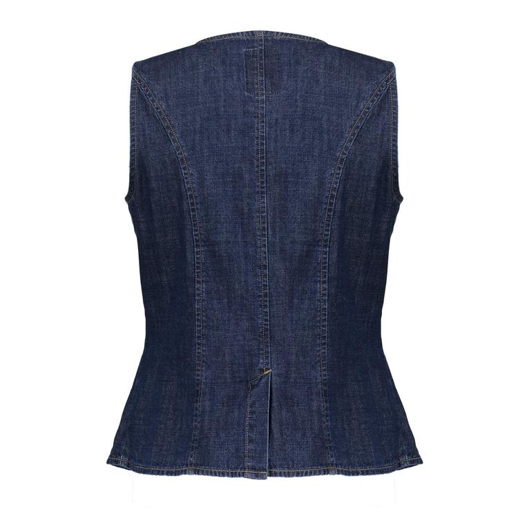 Dit gilet uit onze S26-1 collectie is uitgevoerd in een rijke dark blue denim washing en maakt deel uit van een stijlvolle co-ord set. Het mouwloze design heeft een ronde hals, contrasterende stiksels en opvallende knopen. De subtiele sierzakjes aan de voorzijde zorgen voor een verfijnd, modern detail dat zowel casual als gekleed te dragen is.