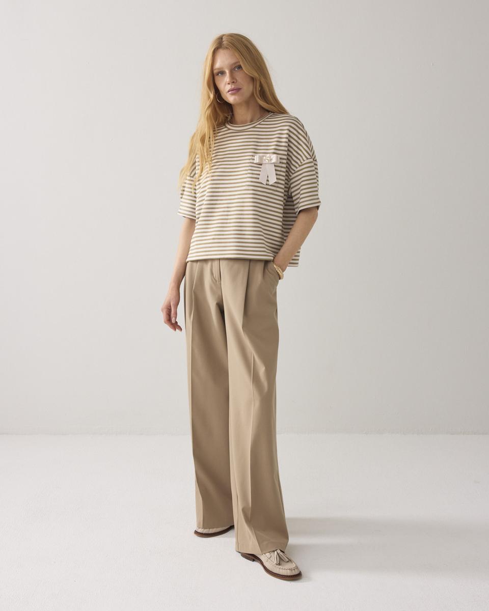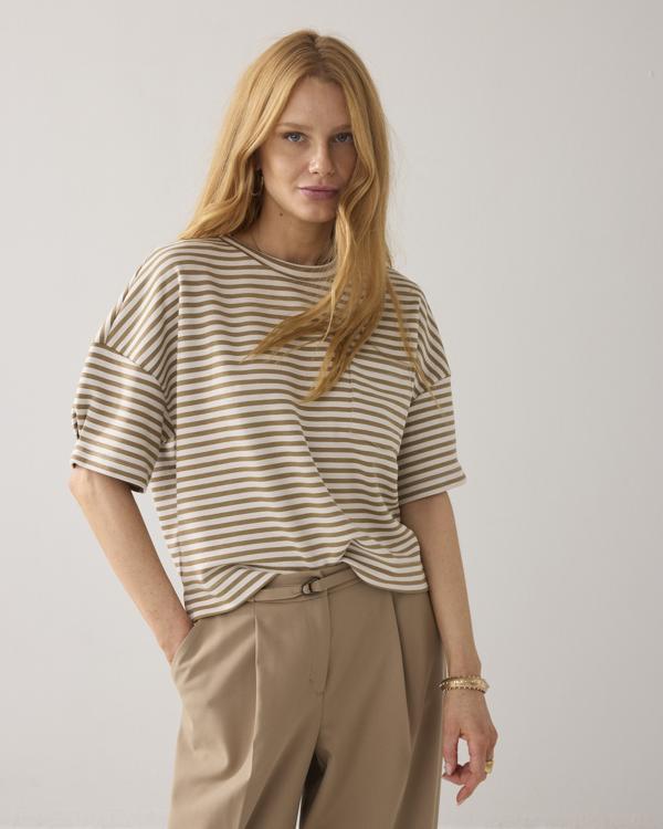 Gestreepte top in een stevige scuba jersey met een boxy fit. De wijde korte mouw heeft een plooitje waardoor deze licht toeloopt. De broche op het opgestikte borstzakje is afneembaar.