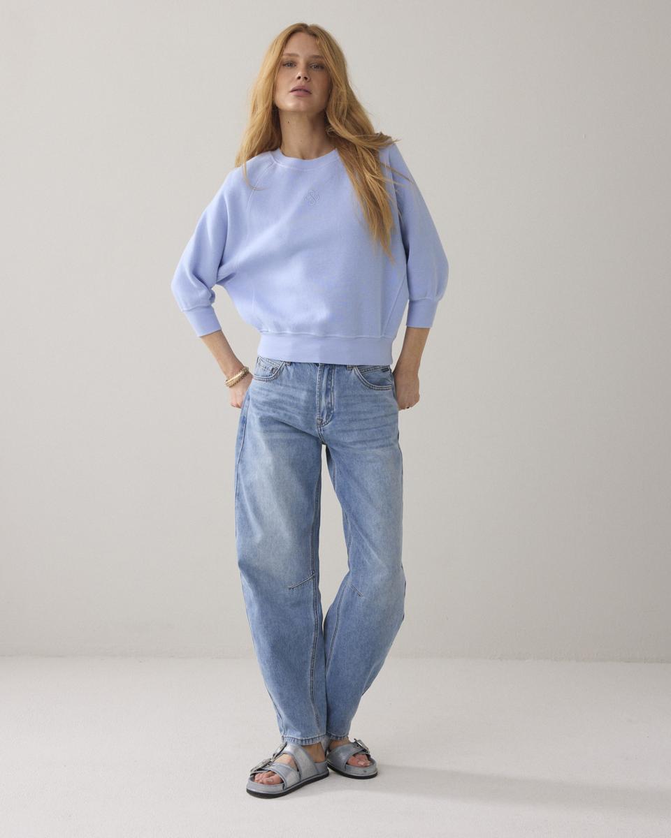 Sweater van zachte stof met een nonchalante loose fit. De trui heeft vleermuismouwen op ellebooglengte, een ronde hals met aangesloten ribboorden en sportieve siernaden. De sweater is voorzien van een klein geborduurd logo op de voorkant.