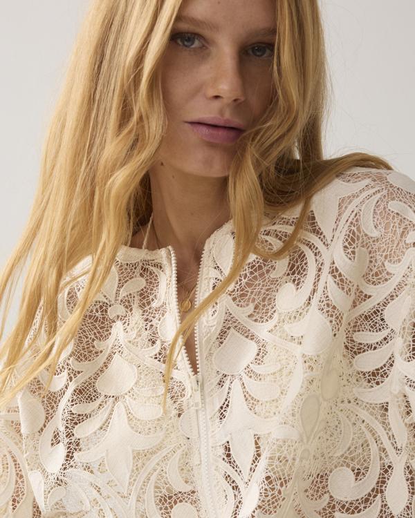 Transparant bomberjasje van een stevige kantkwaliteit. De bomber heeft een ballonvormige onderkant met elastiek en een blokrits.