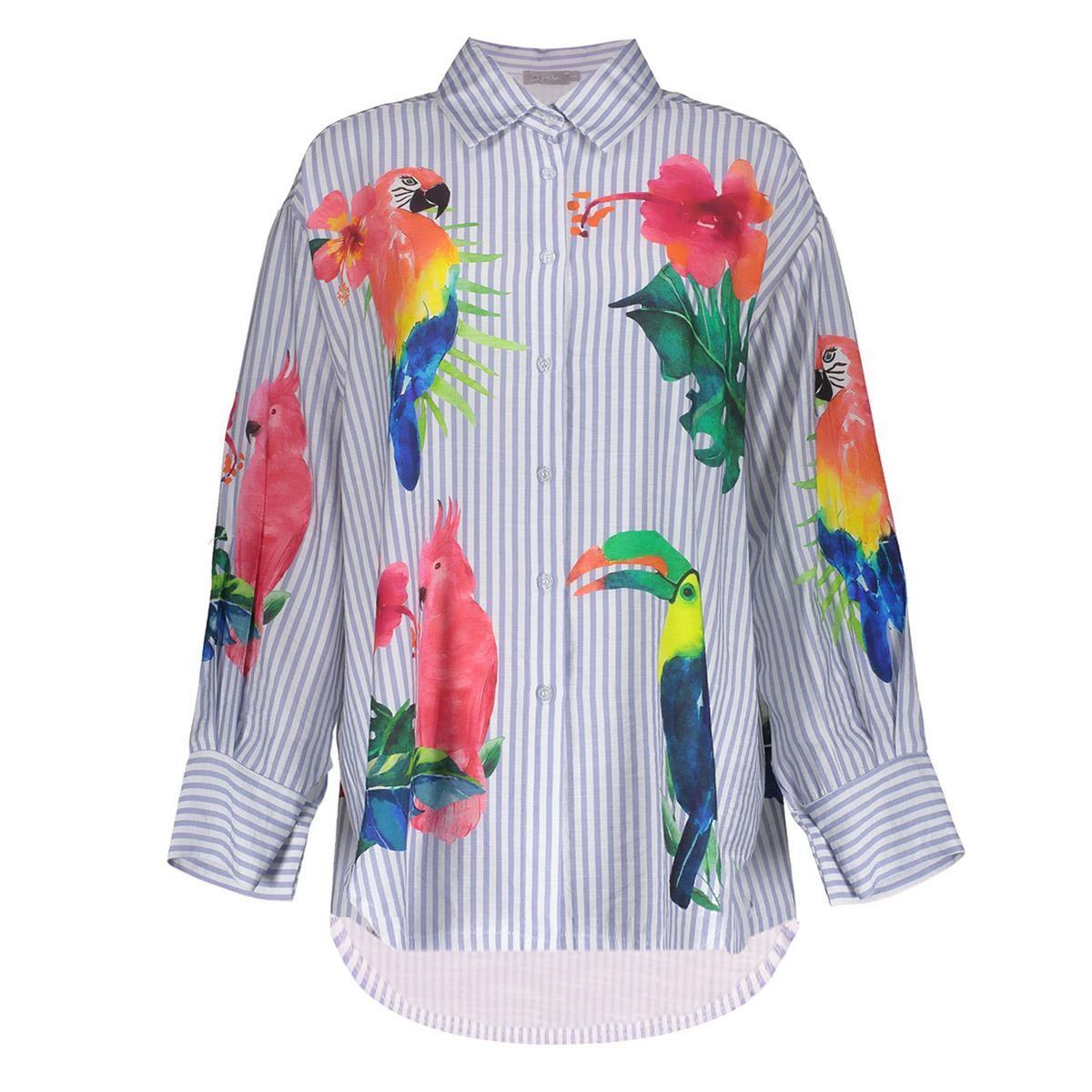 Deze blouse uit onze S26-1 collectie is een echte eyecatcher met karakter. De klassieke streep krijgt een speelse twist door de kleurrijke tropische print met papegaaien, bloemen en bladeren. De doorknoopsluiting en kraag geven een tijdloze basis, terwijl de losvallende fit en langere achterkant zorgen voor een nonchalante, vrouwelijke uitstraling. Perfect op een denim rok of jeans voor een zomerse look.