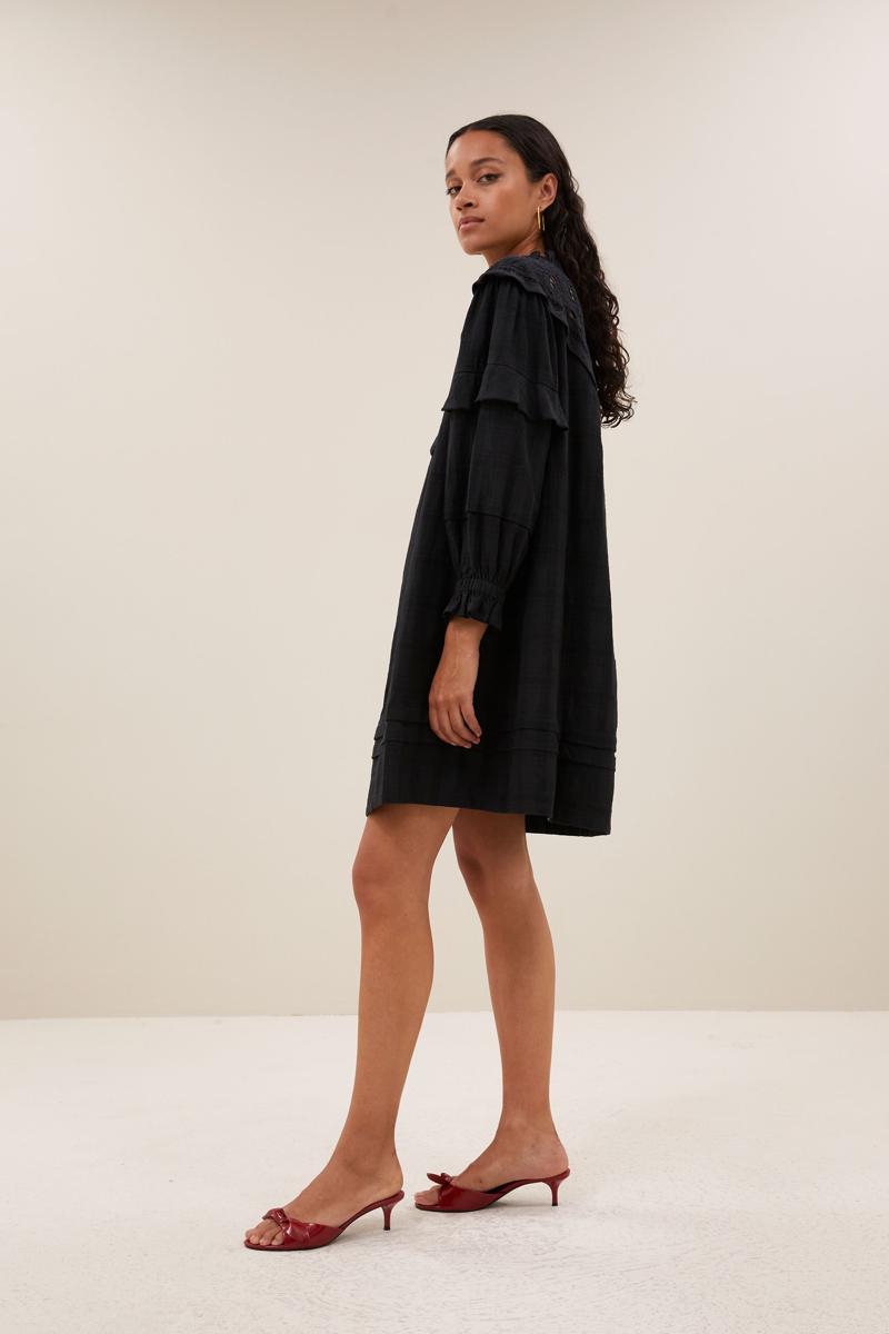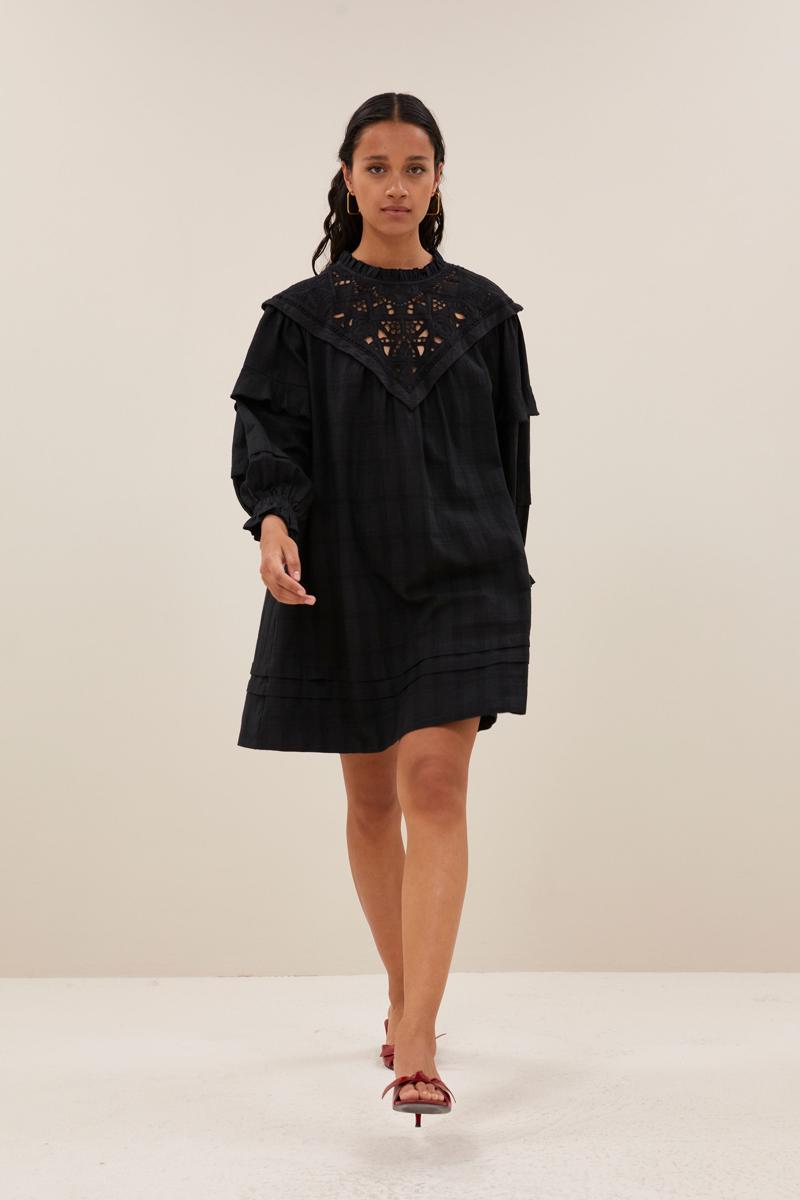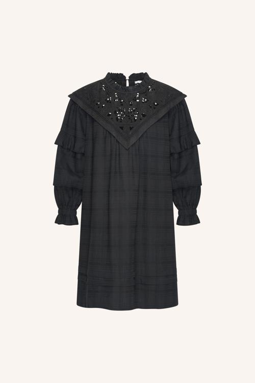 De bowie dress heeft een losvallende pasvorm en een stijlvolle opstaande kraag, perfect voor feestelijke gelegenheden. Het borduurwerk geeft een subtiele, elegante touch aan deze knielange jurk, waardoor je moeiteloos straalt tijdens speciale momenten. Een comfortabele en chique keuze die je zelfvertrouwen laat spreken.