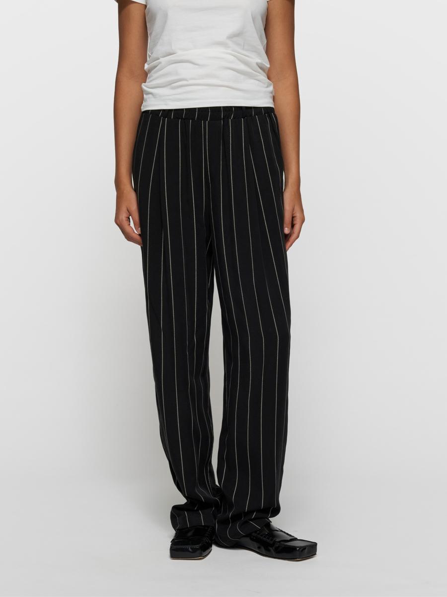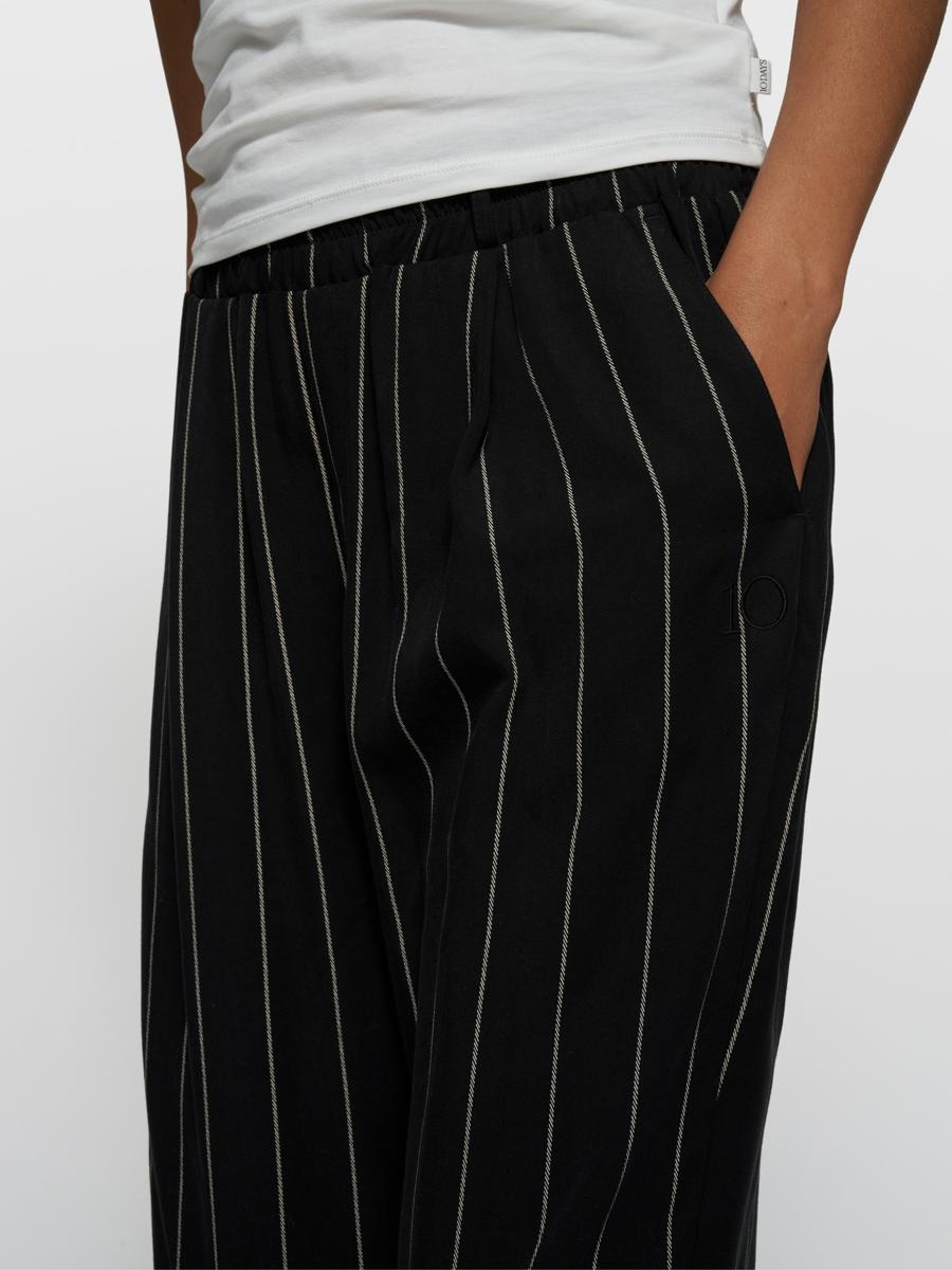 Relaxed fit flowy broek met pinstripes, gemaakt van zachte twill. Voorzien van een elastische tailleband met riemlussen, schuine steekzakken, nepachterzakken en een ‘10’ monogram borduring onder de linker steekzak. Let op: binnenstebuiten strijken.