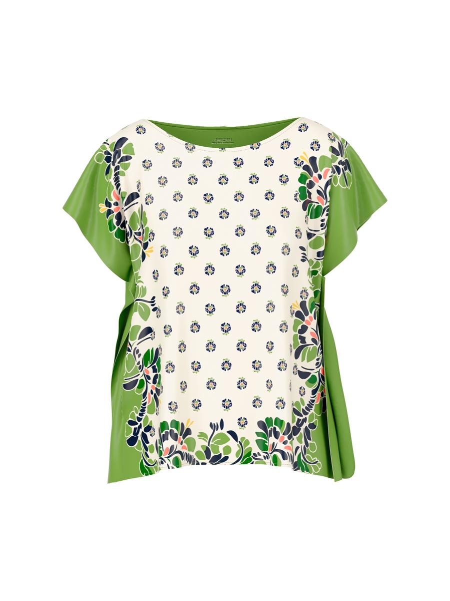 Het losjes gesneden blouseshirt maakt indruk met een hoogwaardige materiaalmix: zijde aan de voorkant, modal met elastaan aan de achterkant voor optimaal draagcomfort. De elegante boothals en korte, aangeknipte mouwen onderstrepen de moderne look. Een bijzonder hoogtepunt is de paneelprint met gestileerde hibiscusbloemen op de voorkant.