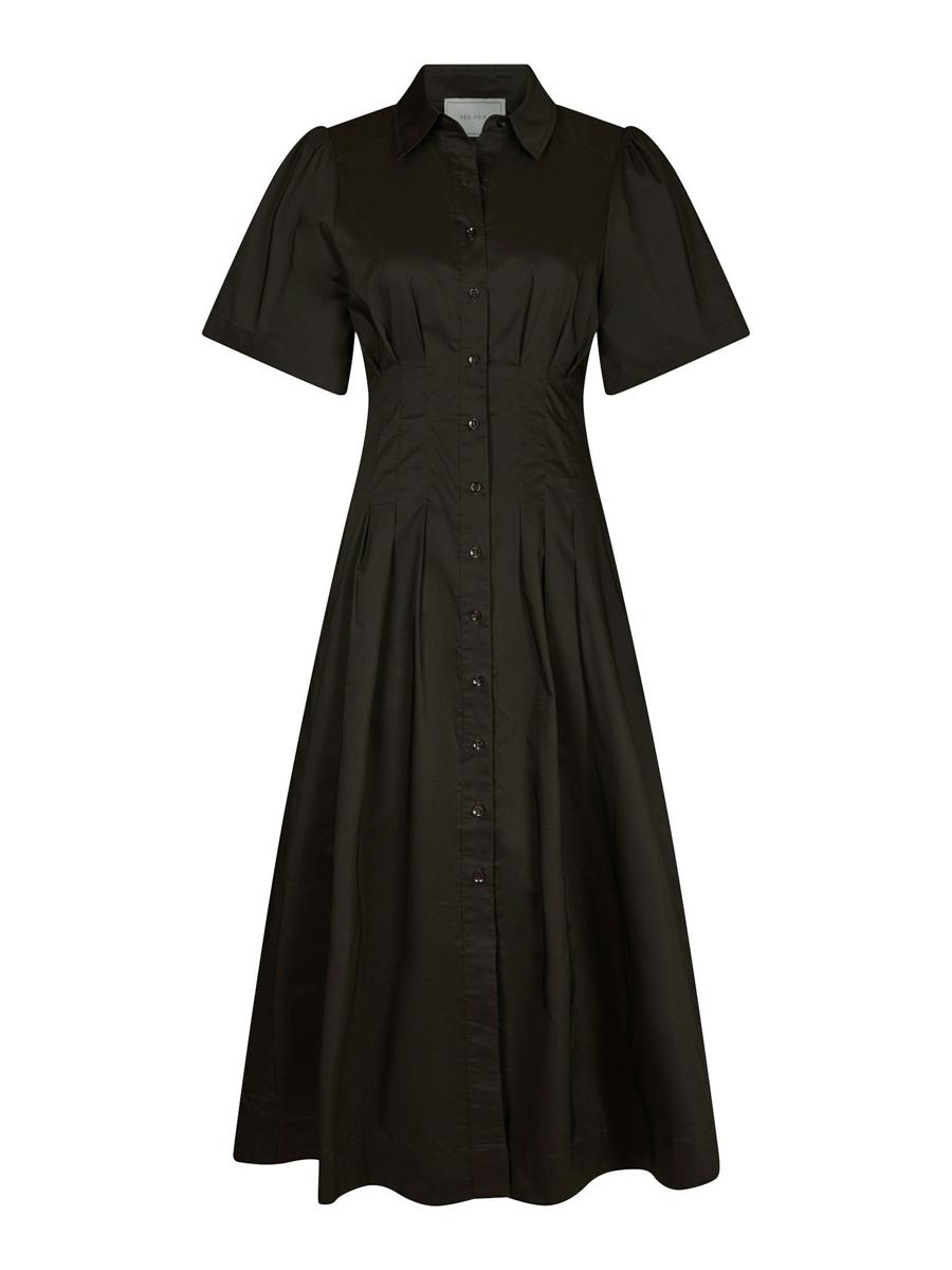 Midi-jurk in een luxe poplin kwaliteit. De jurk heeft pofmouwen, knopen aan de voorkant en heeft een getailleerd ontwerp. Het model is 176 cm en draagt maat 36.