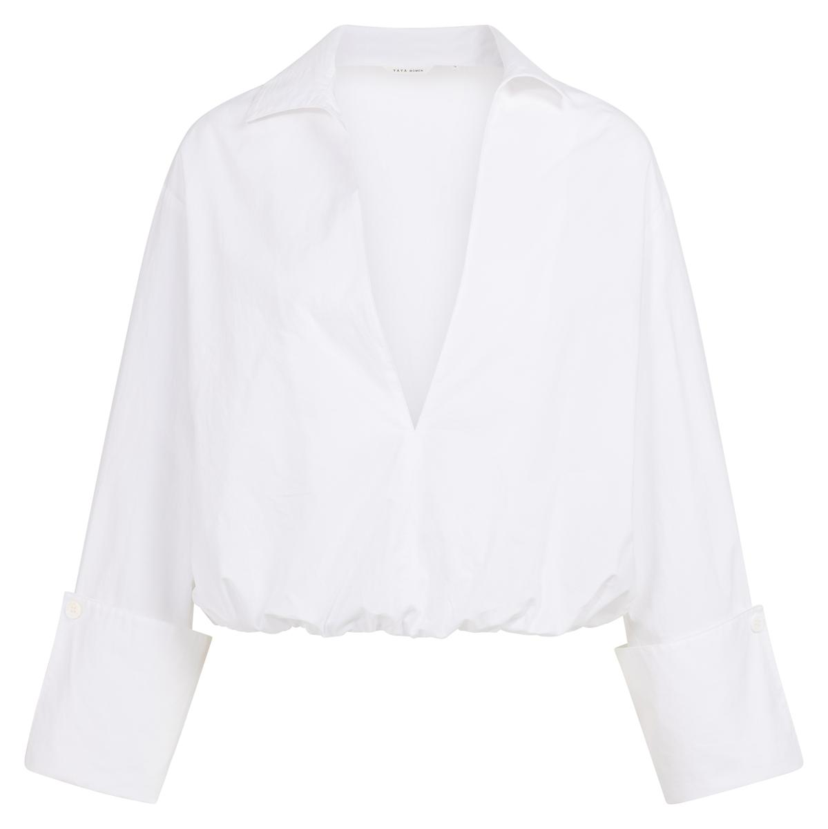 Deze witte blouse is ontworpen met lange mouwen, een diepe V-hals en een elegante kraag. De elastische ballonzoom geeft een moderne, speelse twist en zorgt voor een subtiele cropped look. Afgewerkt met brede manchetten voor een verfijnd detail. Gemaakt van een luchtige, zachte stof perfect voor een stijlvolle en comfortabele outfit. Het model is 175 cm en draagt maat 36.