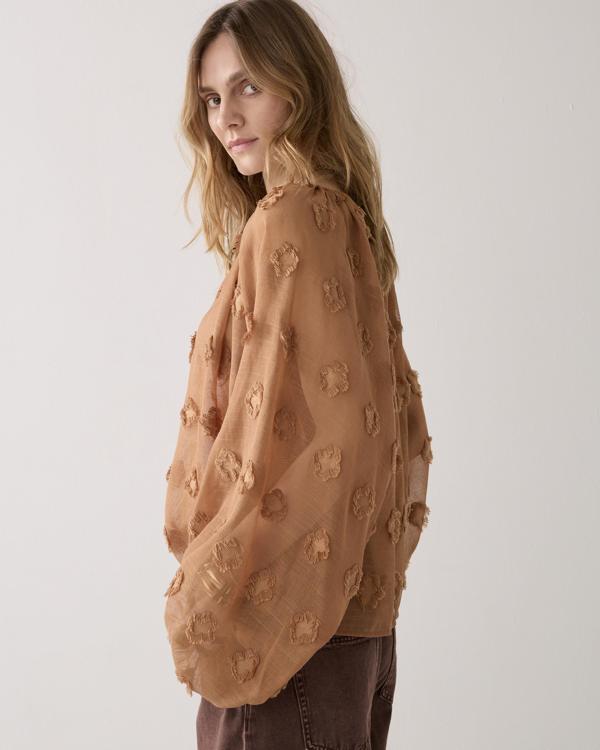 Top in een transparante kwaliteit met een oversized fit en speelse 3D-dotdetails. De top heeft ballonmouwen met een aansnoerbaar elastiek.