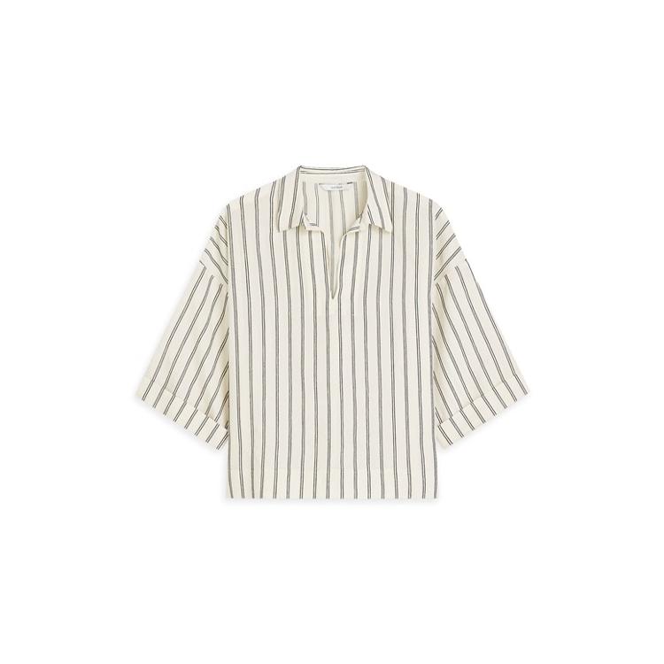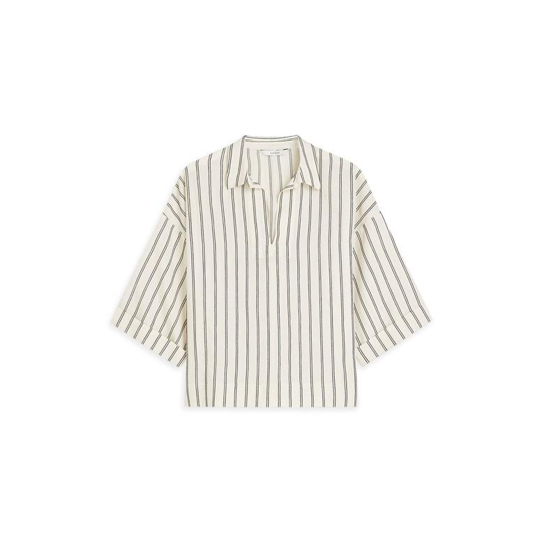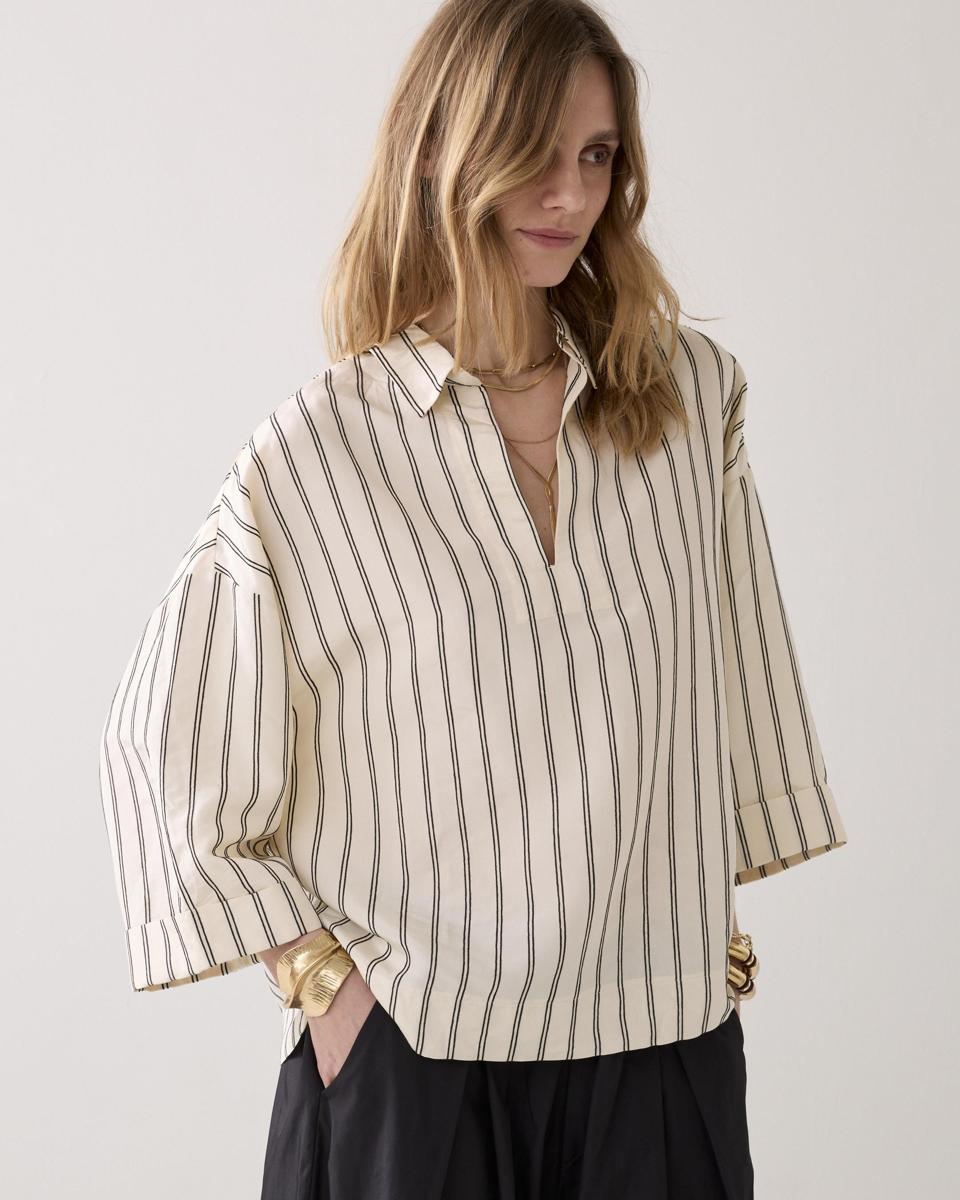 Top in een katoenen stof, geweven met chenillegaren: voelbare streep. De top heeft een open splitkraag, verlaagde mouwinzet en wijde, rechte mouwen met omslag.
