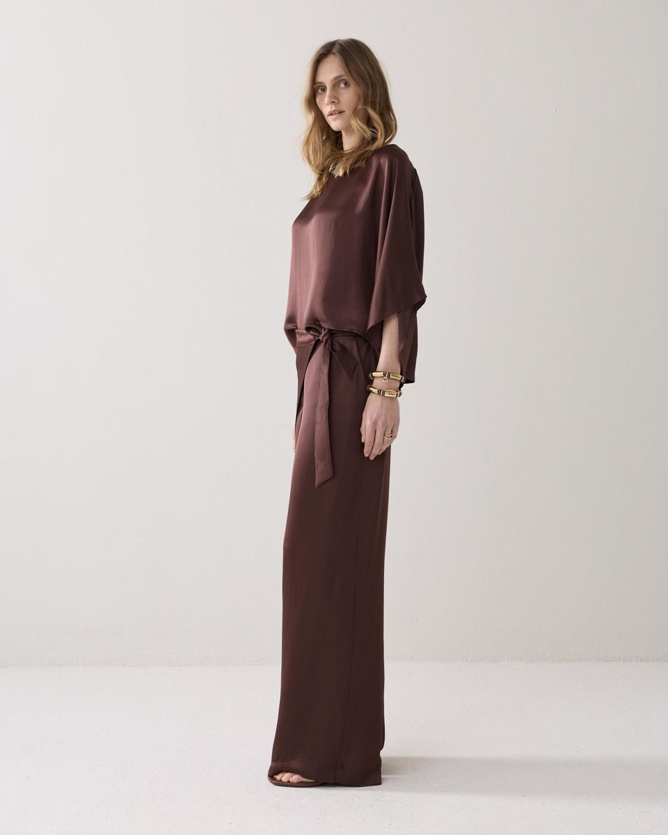 Wijde broek van heavy silk-kwaliteit met aan de voorzijde een overslag vanuit de zijnaad. De broek heeft een gladde tailleband voor en een elastische achter. Op de achterkant zitten strookzakken.